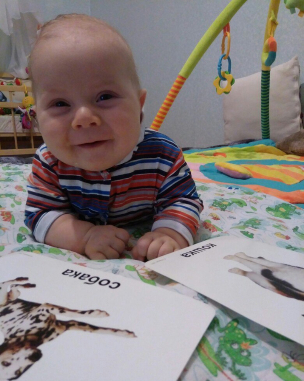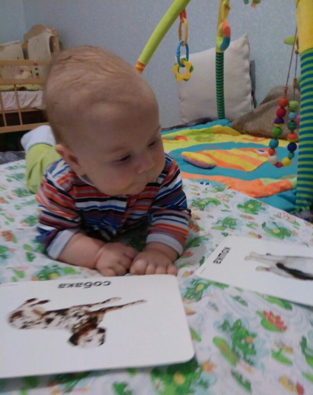 Потом мама мяукала и гавкала, от чего Гошка пришел в неописуемый восторг))) Иногда представляю, как выгляжу я со стороны во время наших игр с младшим, и мне становится еще веселее. Слава Богу, муж уже привык к нашим эмоциональным занятиям .. Так вот после игр с Гошей не стала убирать далеко карточки и приготовила несколько игр для Славушки. Начали с сортировки. Перемешала несколько тем (одежда, продукты, мебель, животные) и попросила ее сначала принести мне все карточки с изображением продуктов, потом все - с мебелью и т.д.