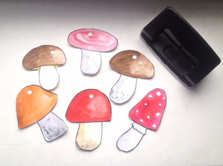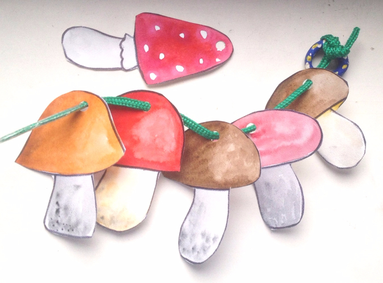 Осенью много грибов. Эх, не сходили в этом году по грибы.. Делаем дырки дыроколом и нанизываем на шнурок. Даже мухомор.