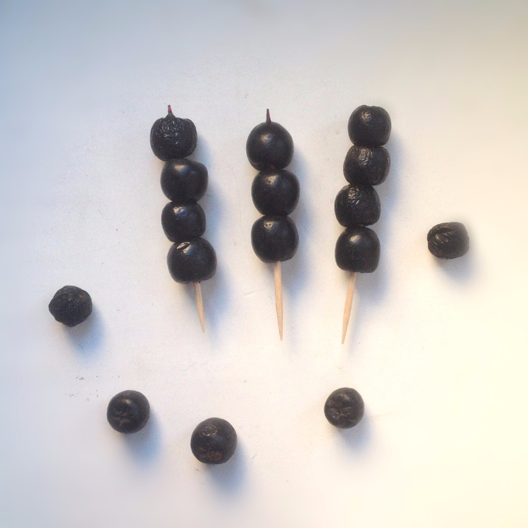 Черноплодную рябину сначала на зубочистки, потом в рот. Сплошные витамины.