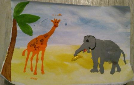 Вот что у нас получилось. Я нарисовала пальму, глаз и ухо слону. ААААА, и ещё банан у слона))))
