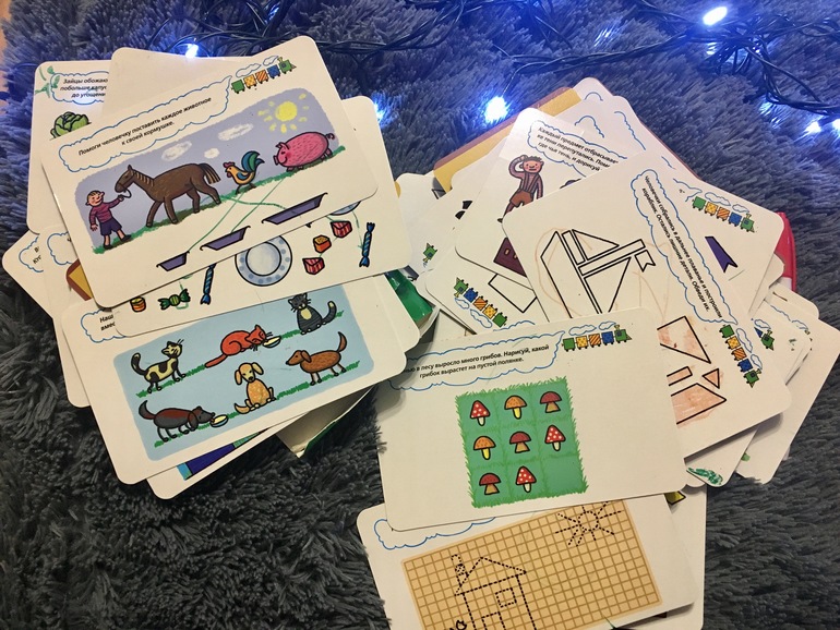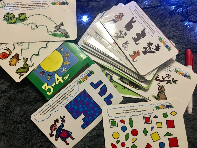 В наборах по 50 ламинированных карточек и водный маркер.Пиши-стирай до бесконечности. Итак,в наборе 3-4 есть лабиринты, проводили, логика, рисовалки. Честно, я не знаю уровень 4-летнего ребенка, для которого эти задания составят сложности.