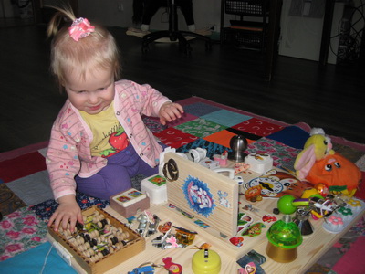 Подарок дочка получила на Новый год. Ей тогда было чуть больше года. Всевозможные крючочки, открывалки, нажималки, крутилки, вертелки, фигурки на магнитах: всё это было воспринято на ура! Правда "вилку" для розетки я убрала.