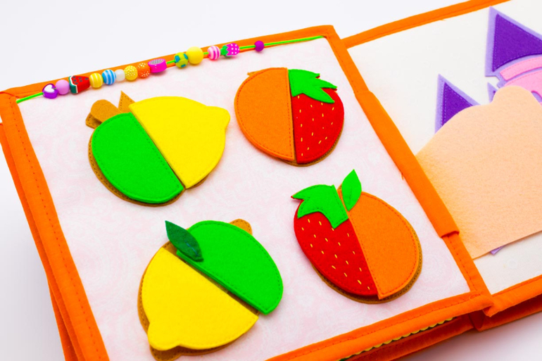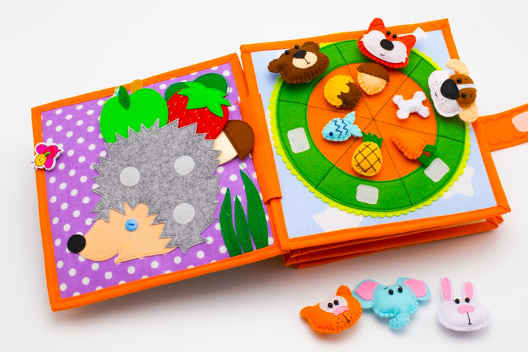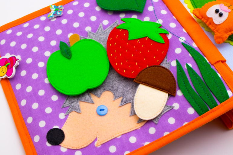 Страница 1. Ежик. Яблоко, клубника и грибочек - съемные элементы на липучках. Пуговицы соединены резиночкой. Игра - перетяжка. Внутри ежика - карманчик.
