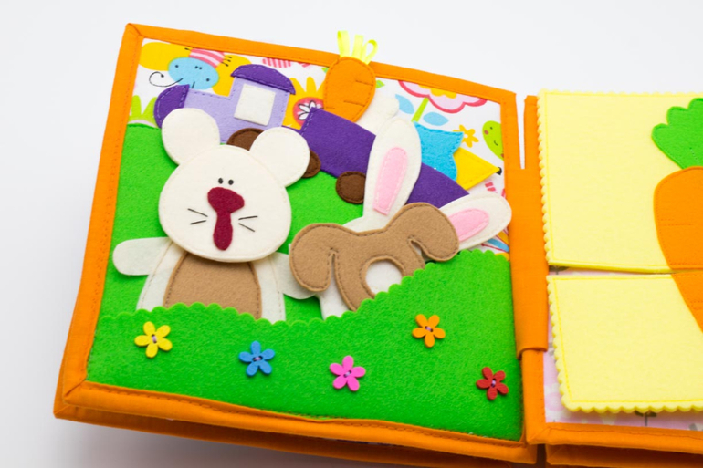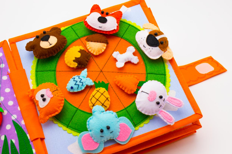Страница 3. Игра - найди свои ушки. 4 пары ушек (кролик, кошка, собака и мышка). Еда зверушек в вагончиках. Изучаем застежку: пришивная кнопка.