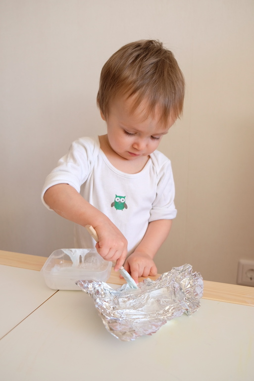 2. Принялись изготавливать Луну. Взяли фольгу и помяли ее. Затем кисточкой помягче покрасили ее в светло-серый цвет. И отложили сохнуть.