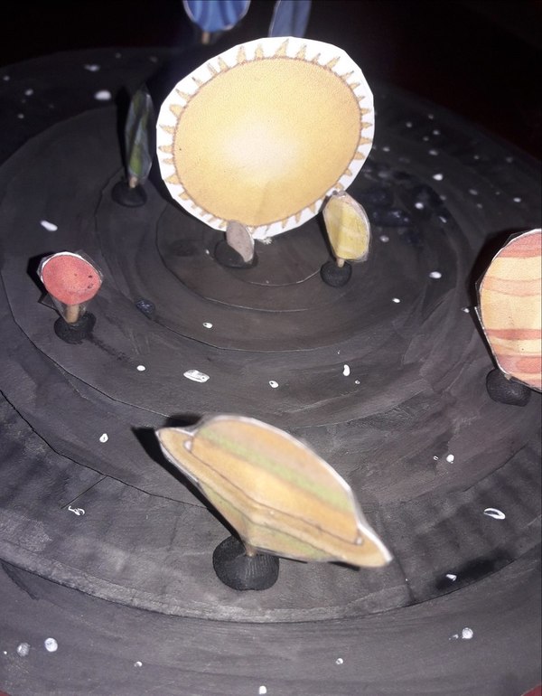 Изготовить макет легко. Нам потребуется восемь кругов разных размеров, двусторонние изображения планет и солнца, скрепки. Скрепляем круги по центру между собой, предварительно покрасив их в черный цвет ( звезды сделала пастой). После на каждой орбите закрепляем планеты.