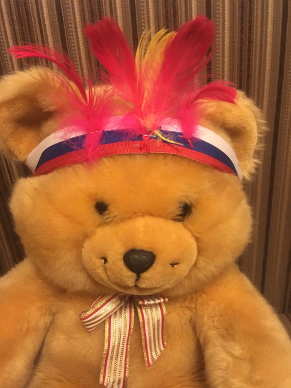 Мы сели вокруг костра. Я была вождем. Посадили наших гостей (кошку и медведя, это любимые игрушки Вани и Тимы, они с ними спят). И дали им трубку мира. Курили короче))