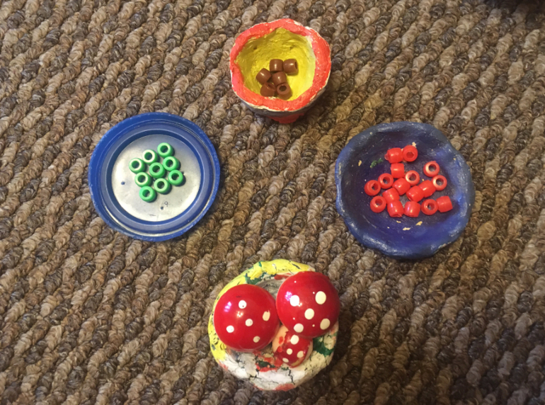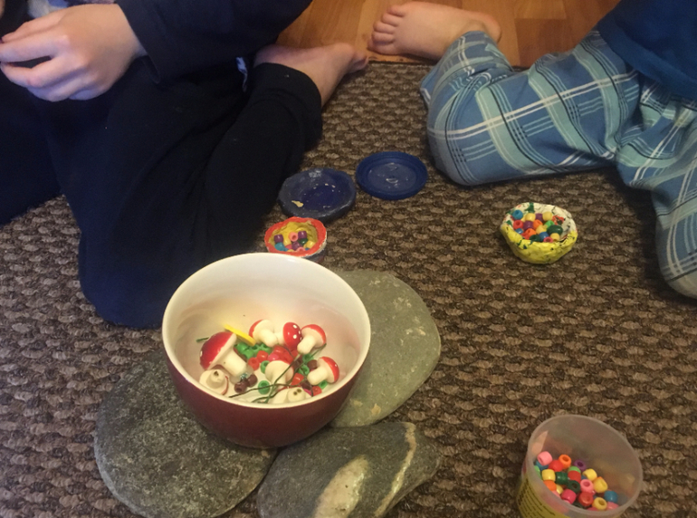 И мы начали готовить свой напиток по рецепту. Например: взять три какао-боба, четыре зеленых ягоды, пять красных ягод. Немного потренировали счет. Потом Тимоша решил улучшить вкус напитка мухоморами и перьями))