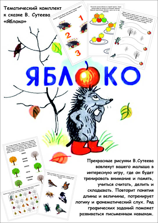 К сказке Сутеева "Яблоко" я подобрала пальчиковые куколоки, реквизит и тематический набор для развития мышления, внимания, памяти и математических представлений.