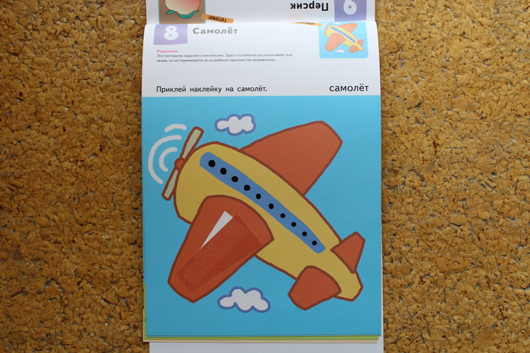 Заданий с наклейками немного. Переходим к собственно аппликации. Мама вырезает - ребенок мажет клеем и клеит. Сначала идут задания на заклеивание области, но обратите внимание - не всё так просто. Наклеиваемые части имеют неодрододный покрас, то есть еще и нужно правильно приложить деталь к фону.
