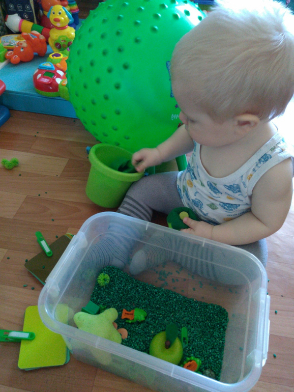 Стартовали с зеленого цвета, ведь проводя много времени на улице, можно бесконечно долго играть с травой и листвой, акцентируя внимание на их цвете. Травку гладим, раскладываем листочки по формочкам и ведеркам, поливаем растения водичкой из лейки, при этом неоднократно повторяя цвет.