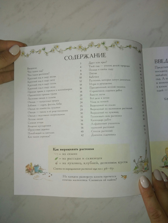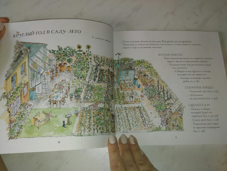 «Как вырастить свой сад» - нежная, красивая книга с очаровательными акварельными рисунками. В книге даны советы о том, как самостоятельно вырастить некоторые овощи, ягоды, пряные травы и цветы. Рассказано о маленьких друзьях сада и его вредителях. О том, почему так важно ухаживать за почвой, что такое сорняки и многое другое. А ещё в книге есть странички для дневника, рецепты блюд, идеи для игр и творчества, занятные экскурсы в историю. Начали читать книгу еще в мае, когда гостили у бабушки. Славка потом с огромным интересом помогала пересаживать рассаду, поливать ее. Расспрашивала бабушку обо всех ее растениях и делилась информацией, которую узнала из книги. Сейчас мы ждем с нетерпением поездки в деревню, где с головой окунемся в будни садовода и овощевода, будем на практике отрабатывать полученные знания, наблюдать за растениями и готовить вкусняшки по рецептам из этой книги)))