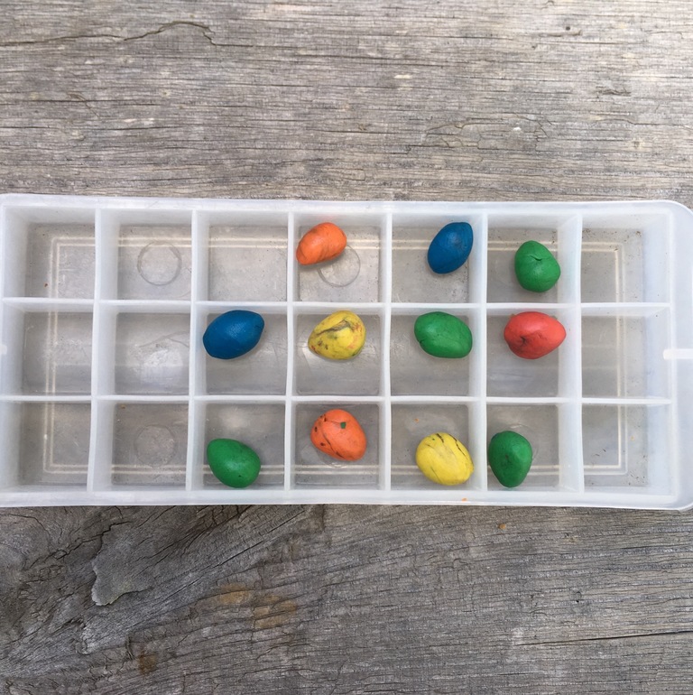 Заодно налепили разноцветных шариков- яиц и раскладывали их по ячейкам, не забыв посчитать