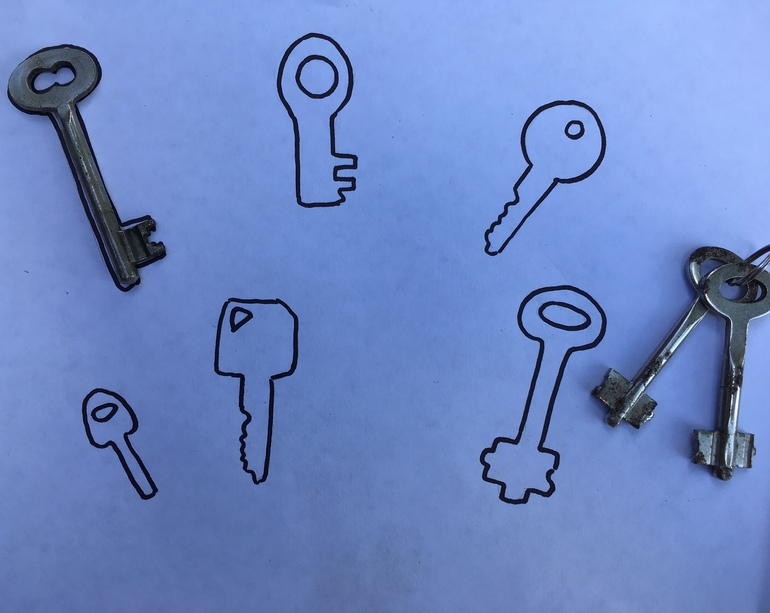 Теперь подбираем к каждому ключику контур (мы сейчас на даче, поэтому у нас много ненужных старинных ключей)