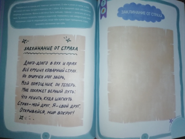 Вот и автор книги предлагает нам вместе с ребенком придумать свое заклинание от страха. По-моему, это отличная идея!