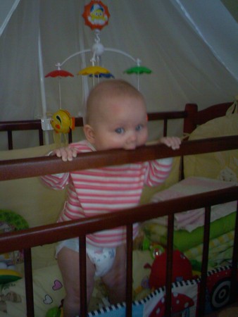 не, сама поставила)))) она так не может пока))) зато стоит,пытается иногда вдоль пройтись. но в основном борт этот жует)))) а вы сами встаете ?