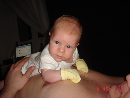 Действие 1-е. Папа/мама кладет масеныша на животик:
