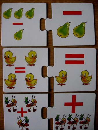 В настольную игру входят картонные карточки достаточно большого размера разрубленных на два элемента по технологии PUZLL. На одних половинах изображены цифры, а на других соответствующие им по количеству предметы