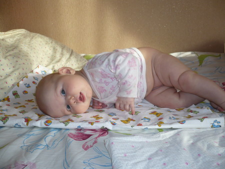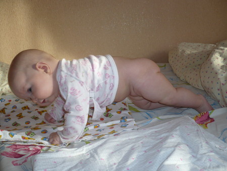Нам 4,5 месяца. Позовчера Маля вдруг поняла, что нужно делать, чтобы встать на четвереньки. Сегодня все утро она упражнялась в этом занятии. Встает и на колени, и на носочки, и вообще выкрутасничает!