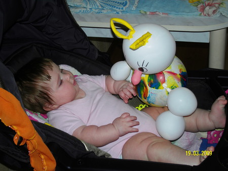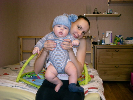 ой какая пухляшка:))) - симпотяшка:))) (ттт чтоб не сглазить), а мы совсем худенькие, все в рост ушло - 70 см:)) а веси 7 900 всего:))) после введения прикорма хоть чуть чуть отъедать бока стали:))) педиатр говорит что все равно не наедим - слишком активные - все в инергию уходит:))) кстати вы еще и волосатеньке такие, а мы лысенькие, не совсем конечно пушок - 1 см везде и посередине эрокез торчит который никак не причесывается:))) - только брови у нас как у брежнева:))) бабушка нас узбечками обзывает:)))