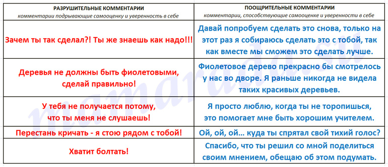 Есть масса способов прокомментировать и откорректировать те действия малыша, которые вас не устраивают. Здесь важно помнить, что слова, которые вы скажете, могут быть «разрушительными» и «поощрительными». Ваша задача - всегда поощрять. Ваша цель - помочь ребенку быть успешным в этом мире, не стать, а именно быть уже сейчас. И вот парадокс, когда дети чувствуют себя успешными во время обучения, они так же чувствуют себя и в жизни.