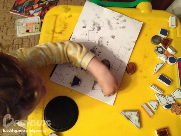 Из минусов - штампики маленькие в детской ручке не очень удобно держать, сынок перепачкался сильно, хорошо что краска легко отмывается водой
