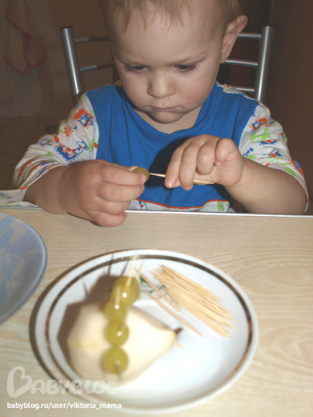 ПитаниеИдею взяла в дневнике NATO_85 . И сегодня вместе с Тимом ее воплотили в жизнь, а также угостили нашего папу. Плюс получились небольшие занятия по Монтессори: чистка банана и проделывание зубочисткой винограда.