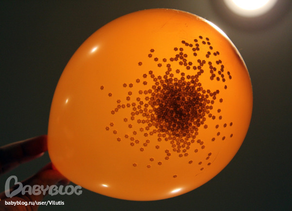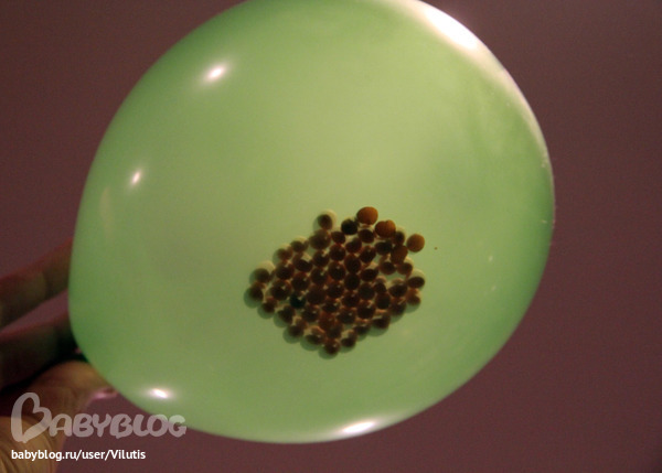 Вам понадобятся воздушные шарики (желательно плотные), а также горох, мелкие макарошки, манка, вода (и др. сыпучие на ваше усмотрение). Шарики наполняются и выдаются ребенку (на радость и пользу ). Желательно еще включить музыку и танцевать с шариками в руках!) Шарик с горохом нам понравился больше всего!