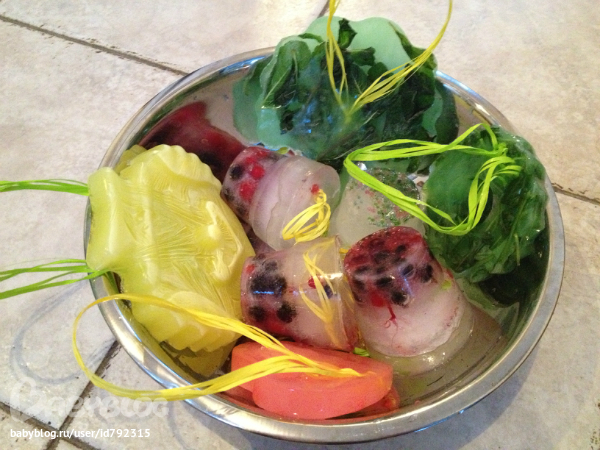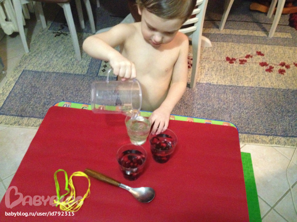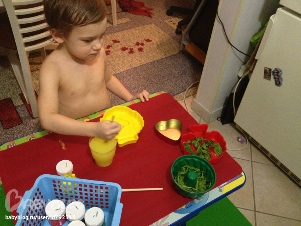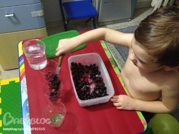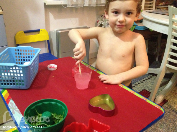 Он очень старался - сыпал ягоды и бисер в стаканчики, заливал их водой, раскладывал мяту и другие травы в формочки, подкрашивал воду, заливал, клал веревочки и помогал мне ставить все это в морозилку )))