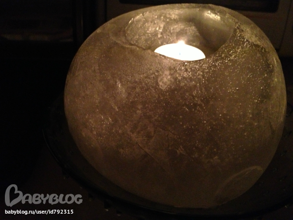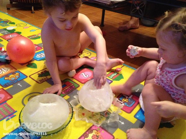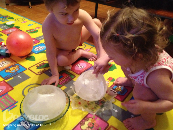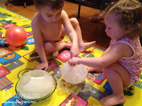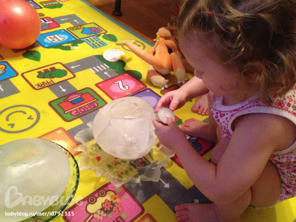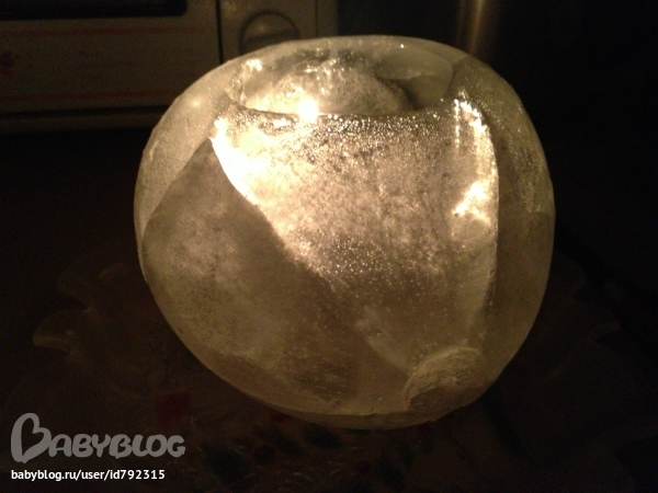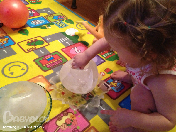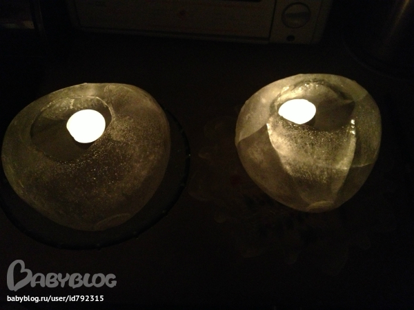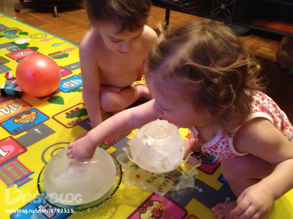 Продолжаем эксериментировать со льдом. Налила воду в воздушные шарики. И по глупости своей поставила их в морозилку рядом (стык долго замерзал) и там получились отверстия (незапланированные))). Надо было мне их потом сделать глубже, так как Анюта тушила свечки прямо пальчиками ))))