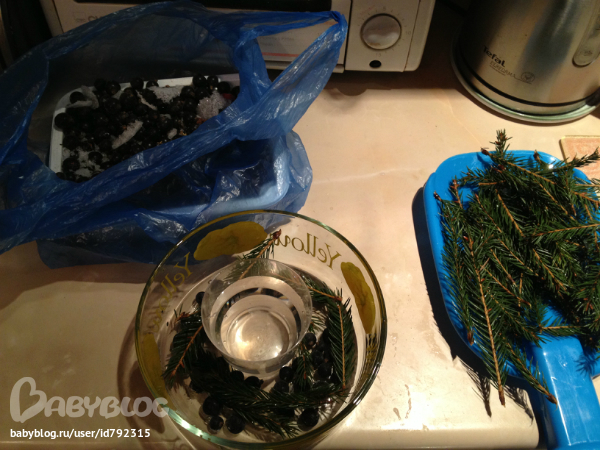 Пока мы гуляли с детками, я нарвала еловых веточек. У бабушки в морозилке нашлась смородина. На воскресенье намечались гости, вот решила сделать сюрприз для всех.