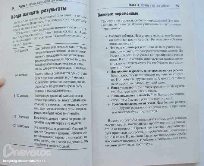 ). В 13 месяцев мой ребенок показал свой первый жест, при этом он уже и говорил некоторые слова типа "мама", "папа" и прочие по возрасту. Через месяц наш словарный запас пополнился еще на несколько жестов и обычных слов. К 1,5 годам мы уже полностью отказались от жестов и говорили самыми обычными словами. По сути в нашей семье ребенок активно пользовался жестами всего около 4-5 месяцев, но результатами я более чем довольна.