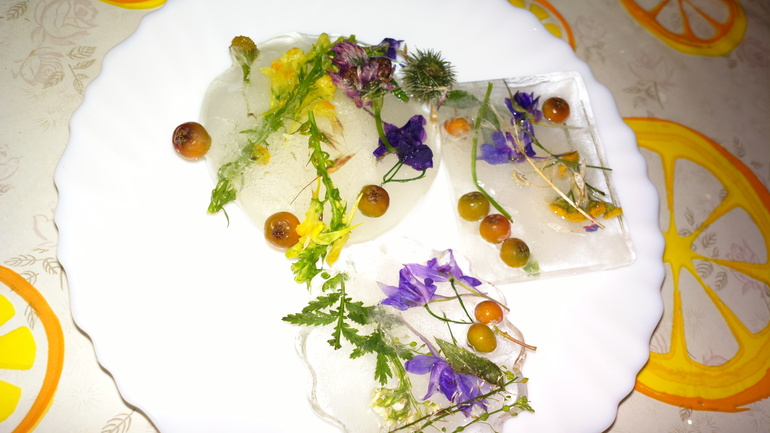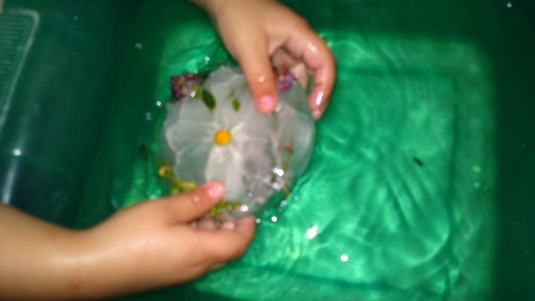 А ещё понравилось сыну погружать саму емкость со льдом в воду, в которой мы замораживали ягоды и цветы. При этом слышно интересное потрескивание, которое очень завораживает малыша."Волсыбство!"-как сказал сынок.