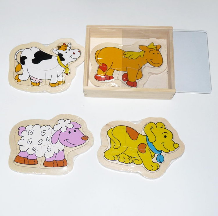 Вообще за такую цену супер набор. Нужно собрать животное из 2 частей, размер не большой, удобен детской ручке. В наборе 12 шт, убираются в деревянную коробочку. Если ваш ребенок мнет и грызет обычные пазлы, то этот вариант будет идеален.