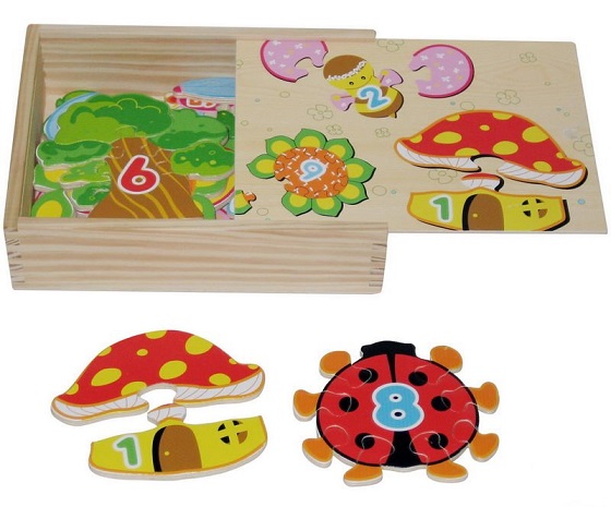 Набор пазлов "Гриб" представляет собой комплект из 9 картинок. Каждая из них состоит из определенного количества составных элементов, позволяющих нет только развивать восприятие и мышление ребенка, но и познакомить его с цифрами и счетом от 1 до 10.Например, пазл Гриб с цифрой 1 состоит из основания(ножка) и 1 элемента, прикрепленного у нему (шляпка). Пазл Божья Коровка с цифрой 8 - из основания (тело) и 8 лапок. И т.п.