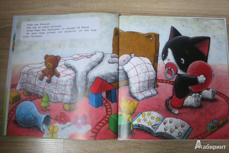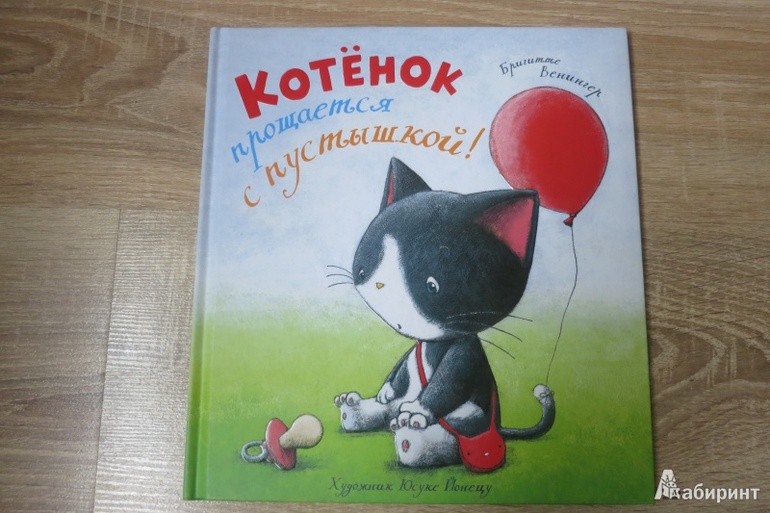 Книга рассчитана на детишек до 3-х лет, текст очень простой, иллюстрации крупные. Нам она не сразу помогла избавиться от соски, но ребёнок задумался и после много-разового прочтения книги (герои очень полюбились еще с рассказа "Спокойной ночи, котенок") решила сама отправить любимую игрушку в путешествие (пришлось гелиевый шар покупать, но это стоило того).