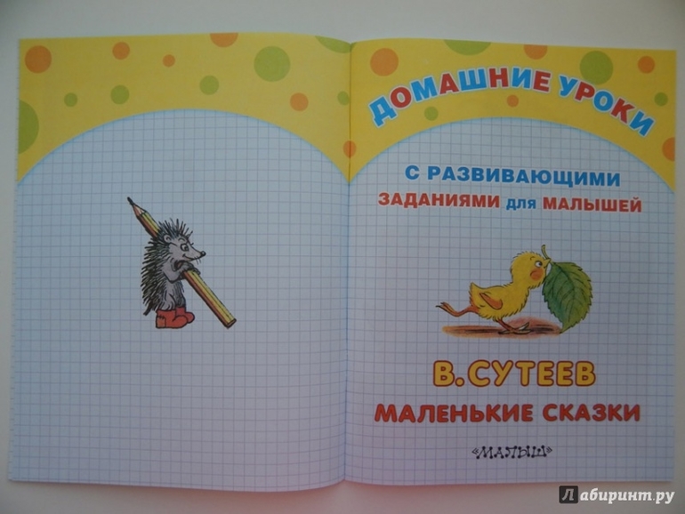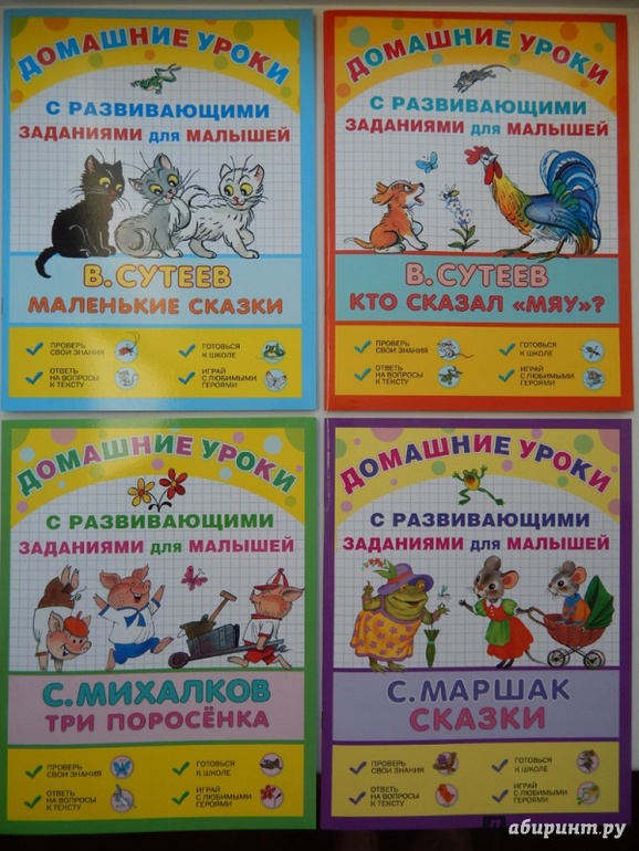 Обратите внимание на новую серию "Домашние уроки" от издательства АСТ. Предназначена для детей старшего дошкольного возраста (4 - 6 лет). Книжка состоит из двух частей. Первая часть - это чудесные сказки В.Сутеева (есть еще Маршак и Михалков) "Три котёнка", "Цыплёнок и Утёнок", "Кораблик". Сказки коротенькие, но милые и забавные. Вторая часть "Домашние уроки", куда входят интересные и разнообразные задания, главными героями которых являются персонажи из прочитанных сказок. Малышам предлагается: