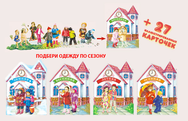 - кармашек для иллюстрированных карточек с изображениями детей в одежде, соответствующей каждому времени года.