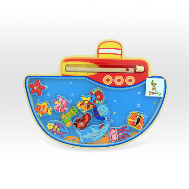 1. Игра рыбалка "Пароходик" - это изготовленная из дерева увлекательная игра, которая состоит из удочки с магнитиком вместо крючка, рамки-вкладыша в виде пароходика и комплекта ярких разноцветных морских обитателей, сундука с сокровищами и другими интересными вещами, которые лежат на дне моря. Всех зверюшек перед началом игры надо положить в пароход. На деревянных фигурках и на конце удочки есть маленькие магнитики.