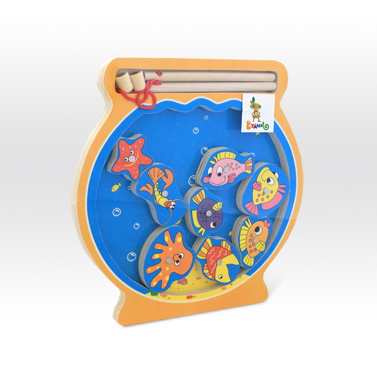 . Всех рыбок перед началом игры надо положить в рамку-аквариум. На деревянных фигурках и на конце удочки есть маленькие магнитики, которые и помогают "рыбачить". Можно рыбачить одному или в компании друзей.