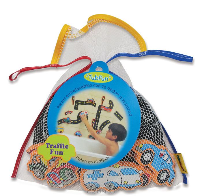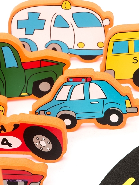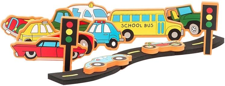 Супер вещь! Во-первых, куча всякого рода автотранспорта: автобус, скорая помощь, полицейская машина, грузовики, седаны). Кусочки дороги, которые можно складывать в магистрали. Крепятся очень легко и прочно. Все яркое, мягкое.