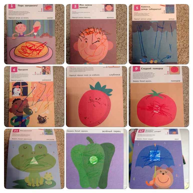 Задания соответствуют возрасту и усложняются по мере продвижения вперед. Ребенок разрисовал за один раз треть тетради сразу, так что их может и имеет смысл как-то ламинировать.