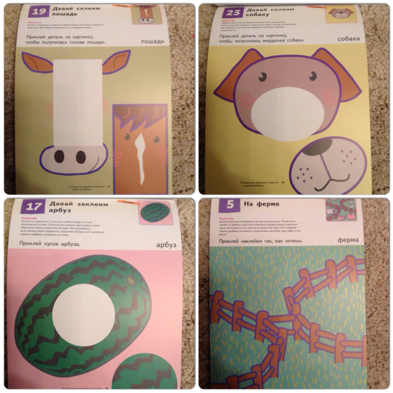 Здесь первые несколько листов с заданиями с наклейками, а затем нужно вырезать отдельные элементы (выполняется родителем), а ребенку нужно наклеить в нужные места данные элементы.