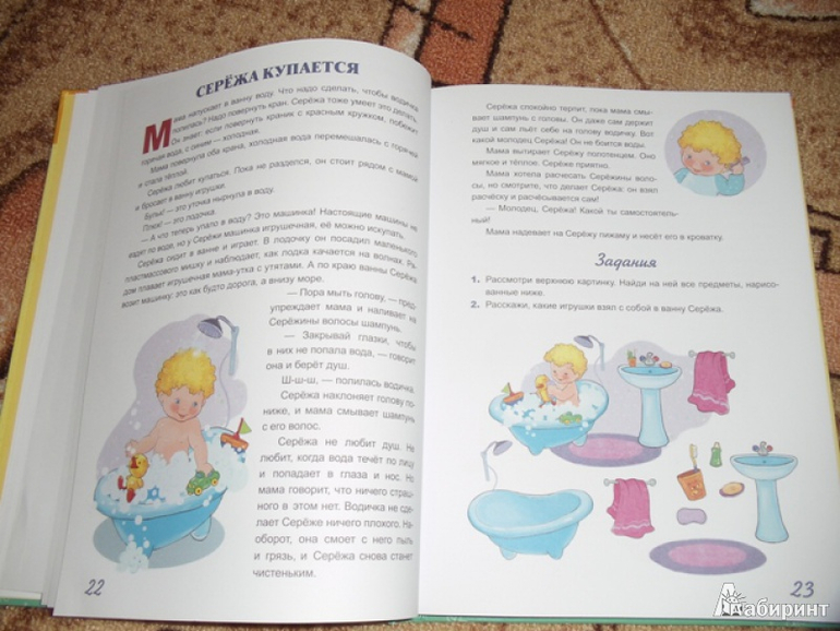 У нас есть эта книга, но я к ней испытываю двоякое чувство. Первое — судя по тексту автор действительно очень хорошо понимает детей. Ребенку и мне очень нравится. Второе, и это минус лично для меня, мне непонятно зачем нужны такие длинные тексты. Аудитория этой книги очень маленькие дети, и не каждый ребенок будет сидеть и слушать текст в одну страницу с одним маленьким рисунком. В этом возрасте нужен текст исключительно по делу, без всяких излишеств. Приходится самой сокращать текст, чтобы ребенок не устал и не начал отвлекаться.