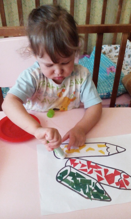 Как мы занимаемся. Делимся опытом.Нимного работ с пластилином и цветной бумагой.