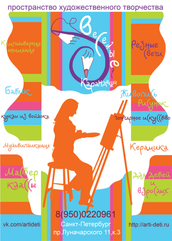 УрокиВеселые карандаши-это небольшая мастерская живописи,керамики, мультипликации,батика; которая создана для тех, кто давно мечтал заняться интересным творчеством и отвлечься от рутины повседневной жизни ,найти вдохновение и научиться чему-то новому.