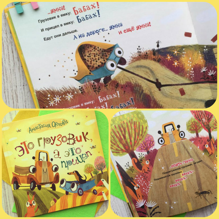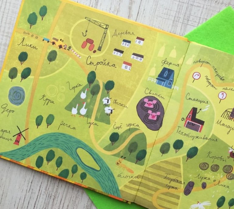 А еще, в книге есть интересно нарисованная карта, движения грузовичка ( на форзаце) Малыши с удовольствием водят пальчиком по дорожке, показывая куда ехать машинке