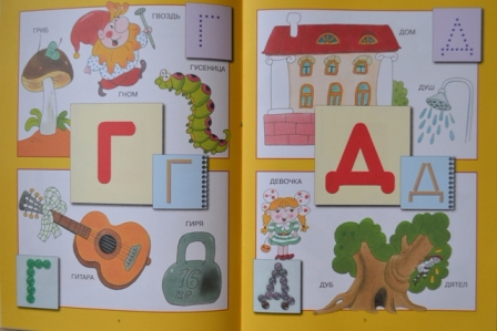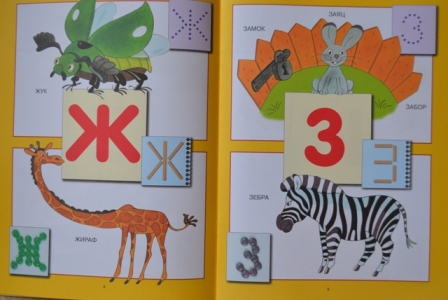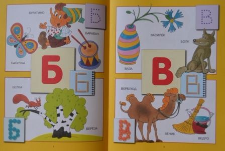 Хорошая книга для знакомства с буквами, на каждую из которых отводится целая страница! В книге предлагается 4 этапа изучения букв: 1 этап: книга просто рассматривается и обсуждается, что в ней нарисовано. 2 этап: называются картинки, нарочито выделяя первый звук "А! Аа-ист!", "А! Аа-наа-нааас!". В следующий раз уже можно показать ребенку, если он сам ее не заметил. 3 этап: при прочтении книги можно поиграть с ребенком, предлагая ему задания на заданный звук. А) Что надо говорить, когда доктор осматривает горло? (а-а-а). Б) Какие звуки издает барашек? (бе-е) и т.д. 4 этап: когда вы посчитаете, что ребенок уже достаточно большой, то можете предложить ему обвести по точкам буковки в верхнем углу каждой страницы. И, наконец, попытаться составить буковки из палочек - на каждой страничке показано, как это можно сделать.