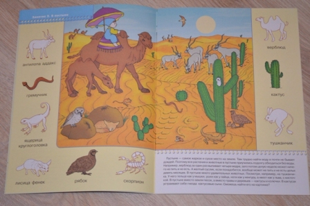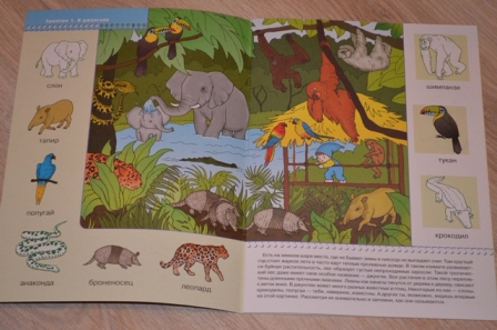 В данном пособии даны красочные, понятные ребенку картинки (животные в местах обитания). Текст написан простым, доступным языком. В книге представлено 6 тем: в джунглях, в пустыне, царство льда и холода, кто в море живет, кто в воздухе летает, кто в земле живет. Карточки, которые даны в середине книги мы не приклеиваем на нужные места, а просто кладем сверху. Таким образом, они становятся многоразовыми.
