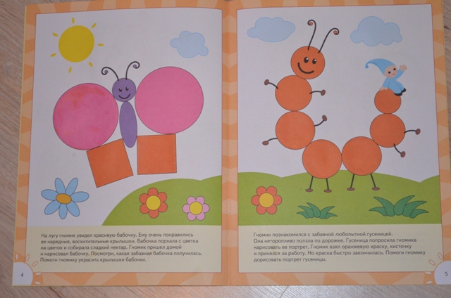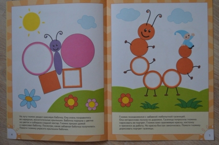 Данное пособие похоже на одноименное только возрастной группы 1-2 года. Моя дочка любит подобного рода задания. Отличие от предыдущего года в том, что здесь геометрические фигуры в картонной вкладке заранее НЕ разделены по соответствующим страницам. То есть ребенку предстоит самостоятельно отыскать нужный элемент и приклеить его на нераскрашенную часть. Понравилось и то, что по сути это не просто аппликация, она дополнена историей про гномика, которому необходимо помочь в том или ином деле.Также здесь есть игра "Разрезные картинки", которая способствует развитию абстрактного мышления и мелкой моторики рук